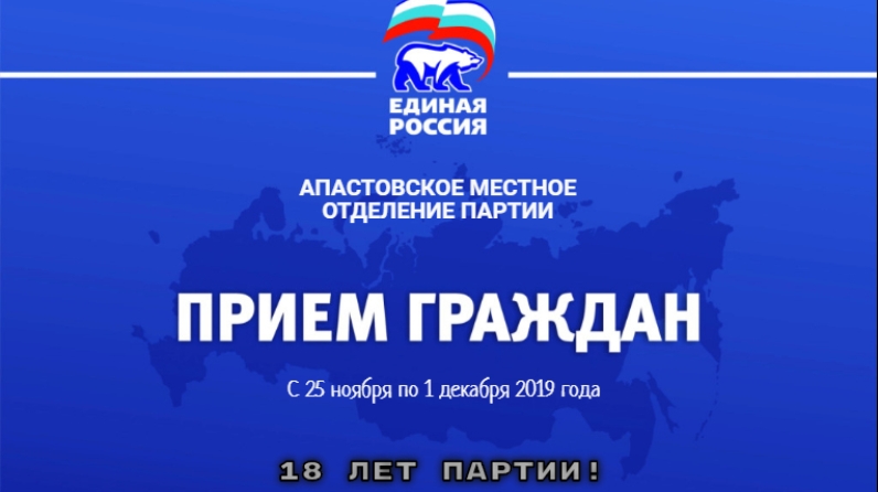 В связи с 18-летием со дня создания Всероссийской политической партии «ЕДИНАЯ РОССИЯ» с 25 ноября по 1 декабря 2019 года в общественной приемной партии в Апастовском местном отделение пройдут приемы граждан.