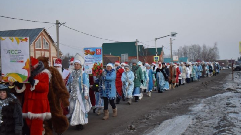 В Апастовском районе в связи с открытием центральной елки в районном центре собралось много Дедов Морозов и Снегурочек Они прошлись по центральным улицам Апастовской, проехав мимо районного Дома культуры. К ним присоединились ученики, одетые в разных животных, героев сказок. Это мероприятие включало в себя проведение акций, приуроченных к 75-летию Великой Победы и 100-летию ТАССР. Все они выстроились в один ряд, поздравили всех с предстоящими праздниками и знаменательными датами, пришли в Центральный парк.