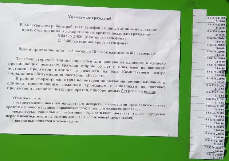 В Апастовском муниципальном районе ежедневно без выходных с 8.00 до 18.00 работает горячая линия по доставке продуктов питания и лекарственных средств одиноким и одиноко проживающим пожилым людям. В районе сформирован отряд из 168 волонтеров, куда вошли социальные работники, фельдшера, работники культуры. По поступившей заявке волонтеры связываются с пожилым человеком, берут деньги и список необходимых продуктов (желательно на неделю), покупают и доставляют со всеми мерами предосторожности в масках и перчатках. Заявка выполняется в течение дня с момента поступления сигнала на горячую линию. На сегодняшний день на телефон «горячей линии» поступили четыре заявки, каждая из которых отработаны своевременно.