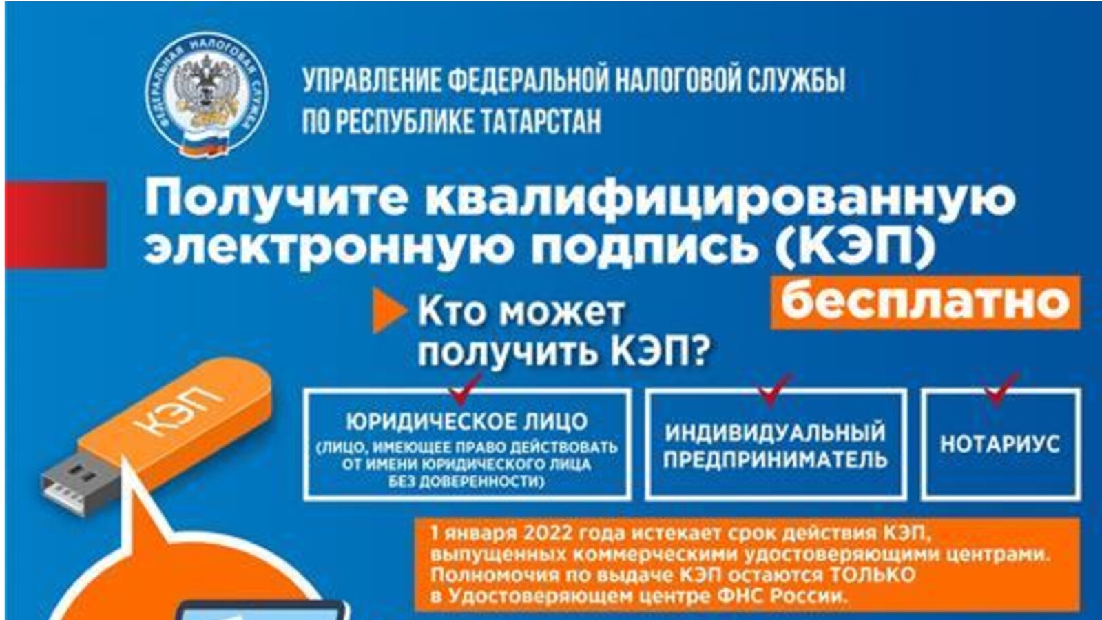 С 1 ЯНВАРЯ 2022 ГОДА ИСТЕКАЕТ СРОК ДЕЙСТВИЯ КЭП, ВЫПУЩЕННЫХ КОММЕРЧЕСКИМИ УДОСТОВЕРЯЮЩИМИ ЦЕНТРАМИ. ПОЛНОМОЧИЯ ПО ВЫДЖАЧЕ КЭП ОСТАЮТСЯ ТОЛЬКО В УДОСТОВЕРЯЮЩЕМ ЦЕНТРЕ ФНС РОССИИ