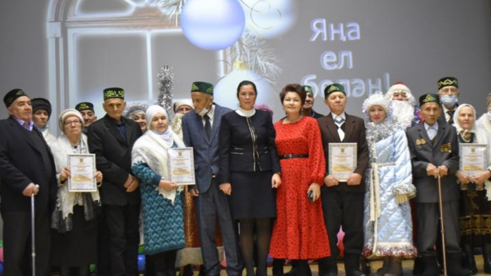 В районном Доме культуры собрались примерные супруги, прожившие вместе 50, 55, 60 лет. Для молодоженов был организован большой новогодний праздник. Каждый из них был приглашен на сцену и получил награды.