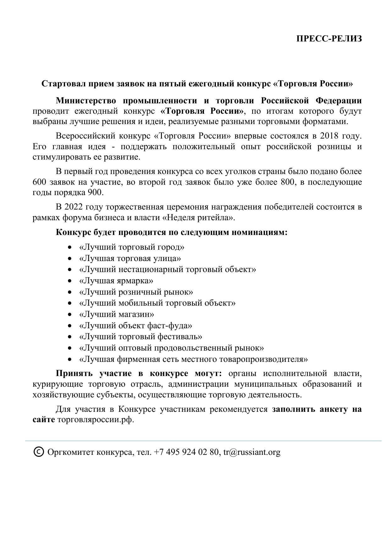 Об участии в конкурсе «Торговля России» в 2022г.