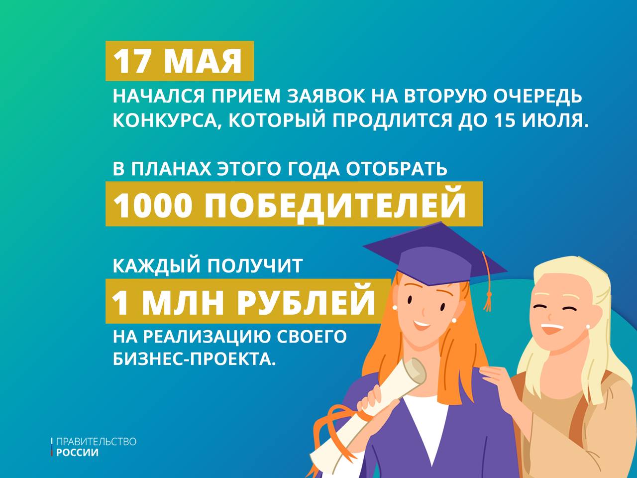 Победители первого этапа конкурса 2022 года скоро получат заслуженные награды. Тем временем продолжается прием заявок на второй этап. О том, как принять участие в конкурсе и побороться за главный приз в миллион рублей на развитие своего проекта, читайте в карточках .