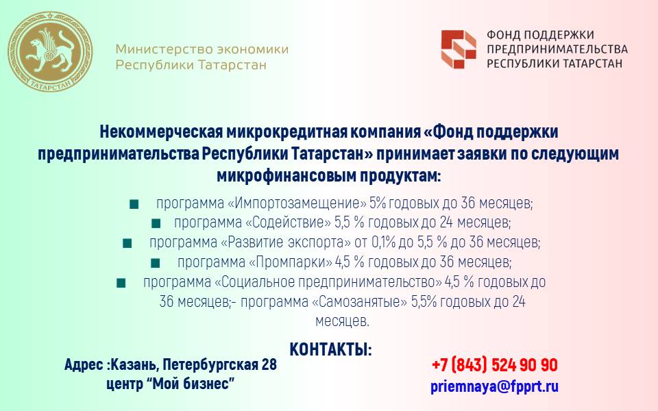 Некоммерческая микрокредитная компания «Фонд поддержки предпринимательства Республики Татарстан» принимает заявки по микрофинансовым продуктам