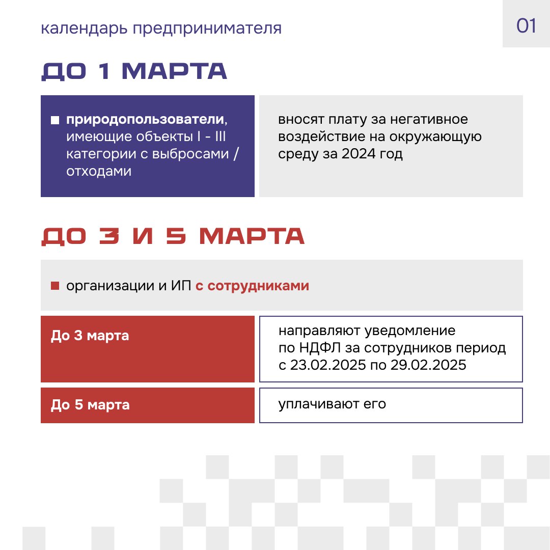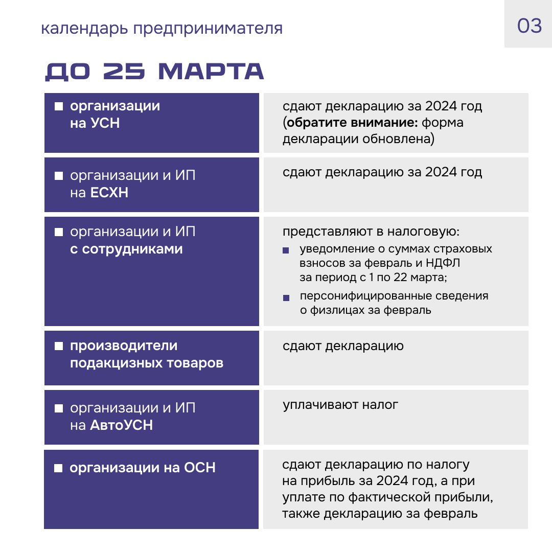Собрали в Календаре предпринимателя все, что необходимо сдать, оформить, заплатить в марте. Например, в первом месяце весны сдают декларации и вносят платежи за прошлый год:
