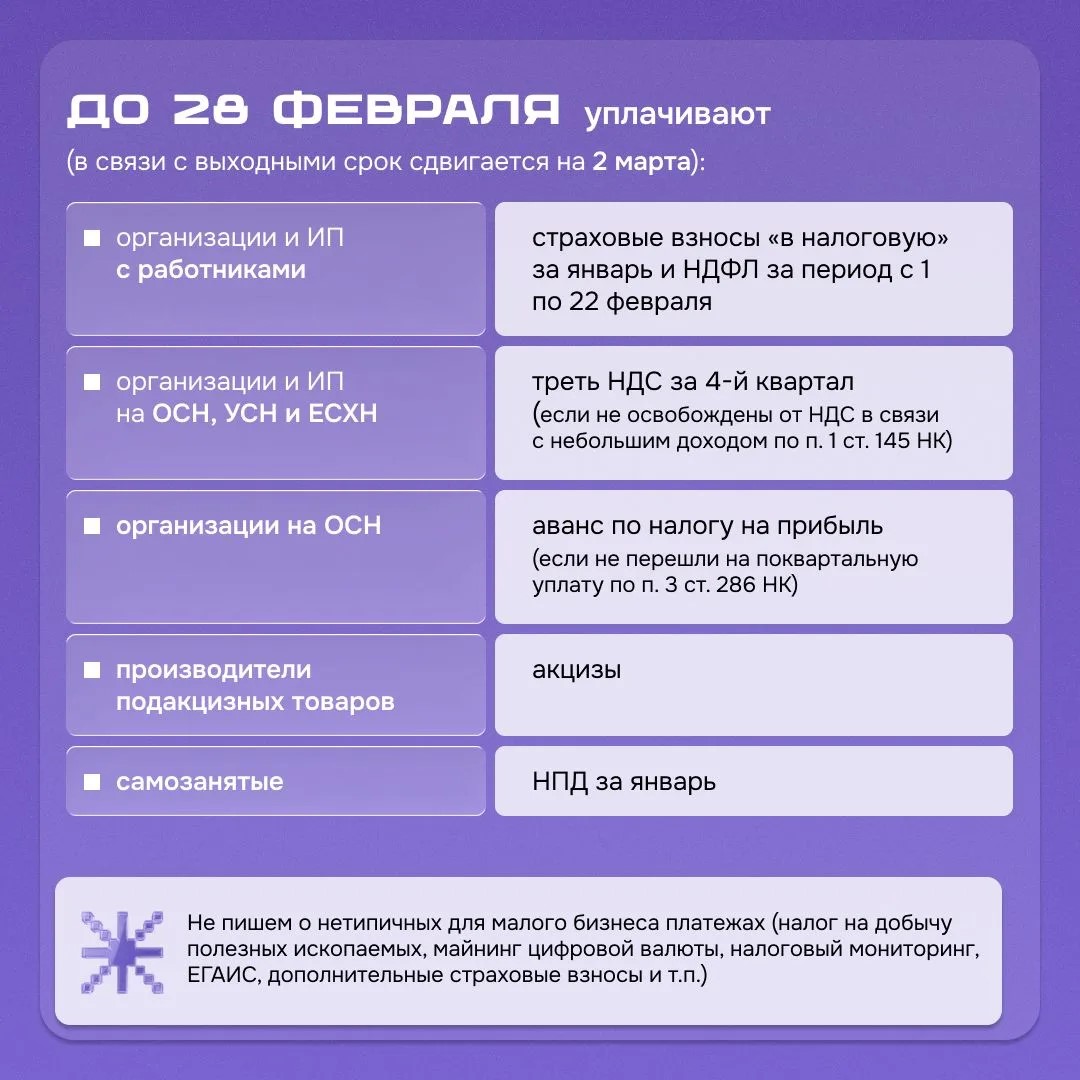 🔳 в связи с выходными многие платежи сдвигаются с 28 февраля на 2 марта;