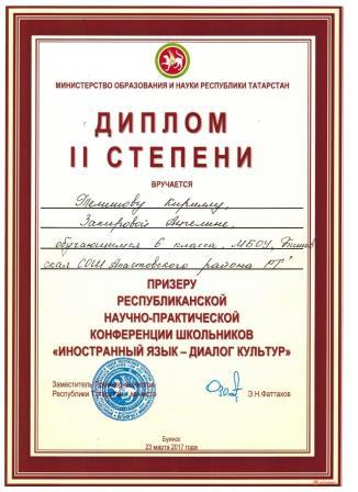 23 марта 2017 г. на базе гимназии №5 г.Буинск проходила республиканская научно-практическая конференция школьников «Иностранный язык – диалог культур», в которой принимали участие учащиеся МБОУ «Бишевская СОШ» и МБОУ «Каратунская СОШ». Ребята показали хорошие результаты. Учащиеся Бишевской школы Телишев Кирилл и Закирова Ангелина (учащиеся 6 класса) выступали на секции «Краеведение» и отмечены Дипломом 2 степени. Каратунская школа презентовали свои исследовательские работы на секциях «Филология» - Диплом 3 степени (Гумерова Алия, ученица 7 класса) и «Страноведение». Самая юная участница конференции Сулейманова Азалия, ученица 5 класса была отмечена грамотой Министерства образования и науки Республики Татарстан как победитель в номинации «Мир моих открытий».