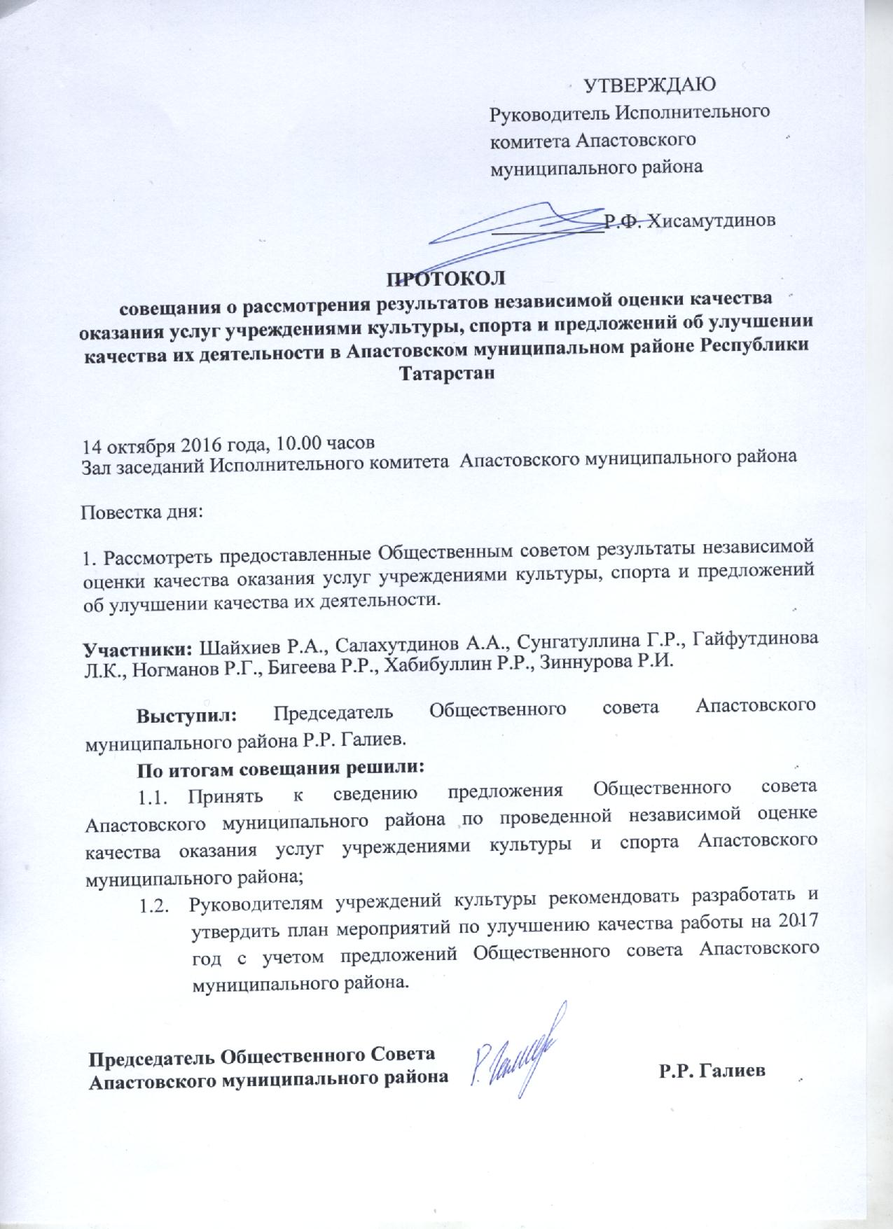 Протокол совещания о рассмотрении результатов независимой оценки качества оказания услуг учреждениями культуры, спорта и об улучшении качества их деятельности в Апастовском муниципальном районе Республики Татарстан