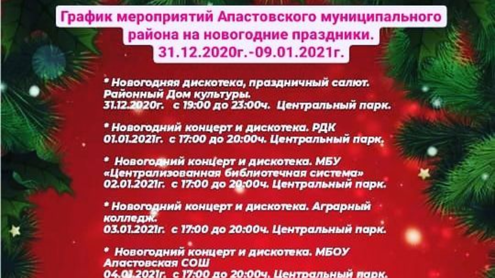 1-9 гыйнвар көннәрендә һәр кичтә Үзәк ял паркында урын алган чыршы янәшәсендә концерт-тамаша һәм бәйрәм дискотекасы булуы көтелә.