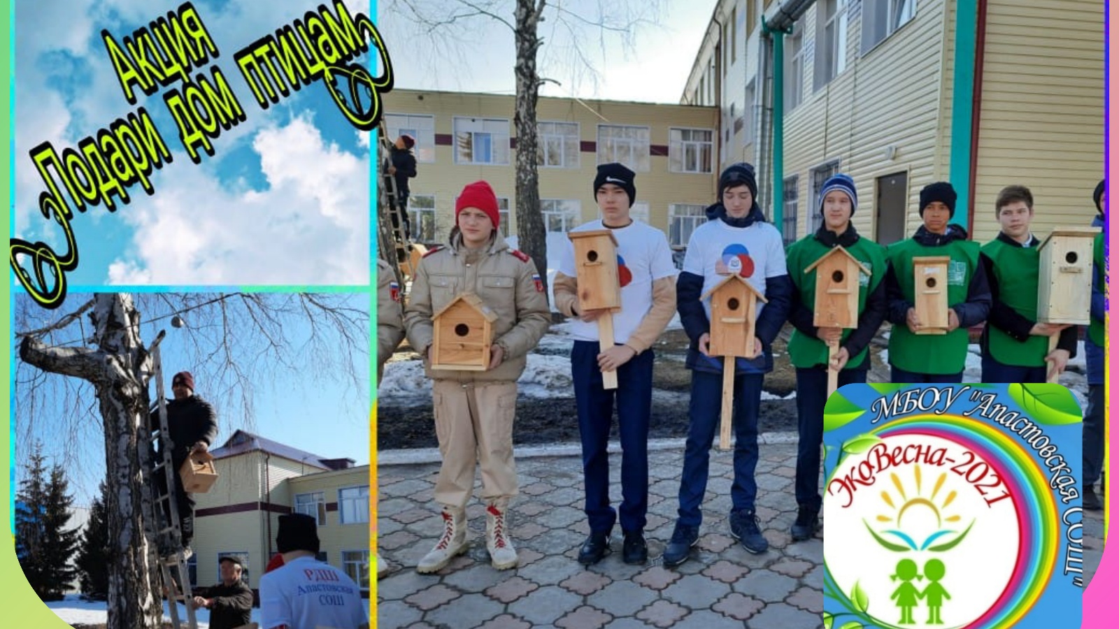 Татарстан Республикасы Апас, Болын-Балыкчы, Борнаш, Кызылтау һәм Апас районының башка мәктәпләре укучылары «кошларга йорт бүләк ит»акциясендә катнаштылар. Ул мәгариф бүлеге, мәктәп директорлары, укытучылар җитәкчелегендә оештырылды. Балалар сыерчык оялары ясадылар һәм аларны мәктәп яны участогында элделәр. Сыерчык оялары кошлар өчен яңа йорт булачак. Балалар шулай ук каурыйлы дусларны мәктәп бакчасына җәлеп итә алырлар, тиздән ул чәчәк ата һәм Апас районы халкын сөендерер, дип өметләнә.