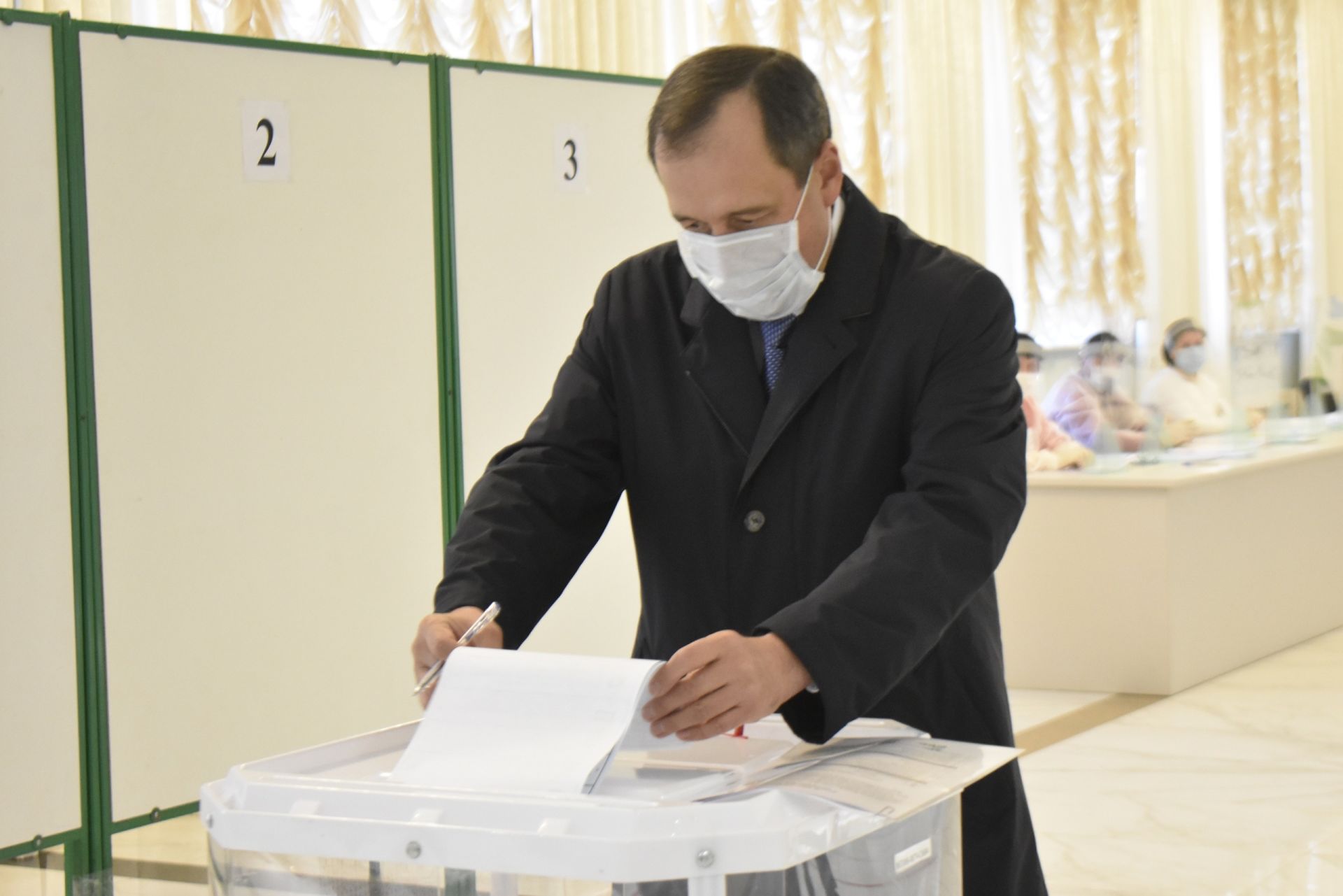 Район башлыгы Равил Хисамутдинов һәм район кураторы, "Ак Барс" банкы идарәсе җитәкчесе Зөфәр Гәрәев район мәдәният йортында урнашкан 879 нчы сайлау участогында тавыш бирделәр.