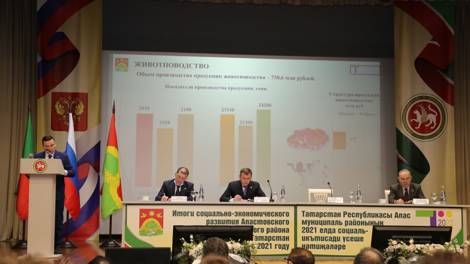 «2021 елда районның социаль-икътисади үсеше йомгаклары һәм 2022 елга бурычлар турында» гы доклад белән район башлыгы Айрат Җиһаншин чыгыш ясады. Үзенең докладында ул шулай ук Апас муниципаль районы территориясендә милли проектларны гамәлгә ашыру турында сөйләде.