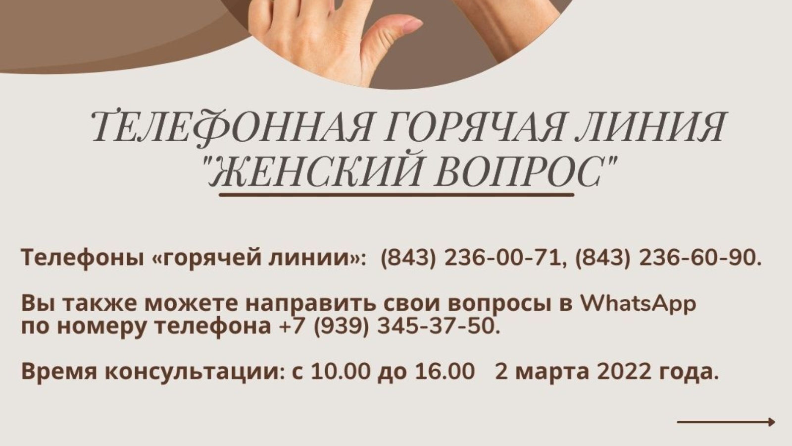 2022 елның 2 мартында, Халыкара хатын-кызлар көне алдыннан, гаилә-көнкүреш көч кулланудан, тормыш-көнкүреш нигезендә Имин булмаган һәм конфликтлардан, хатын-кызлар сәламәтлегеннән яклау, хезмәт хокукларын үтәү, балаларны белем бирү учреждениеләренә урнаштыру, балалы гаиләләрне социаль яклау һәм социаль тәэмин итү, торак-коммуналь хуҗалык мәсьәләләре буенча «хатын-кызлар соравы» телефон линиясе узачак.