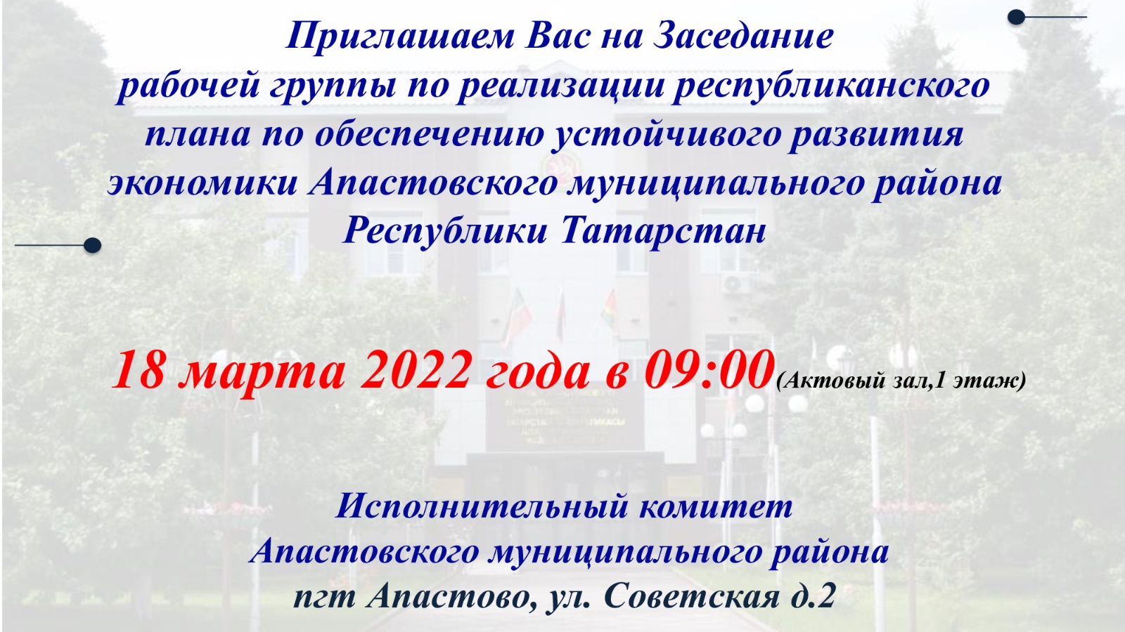 СЕЗНЕ 2022 ЕЛНЫҢ 18 МАРТЫНДА 9.00 СӘГАТЬТӘ ТАТАРСТАН РЕСПУБЛИКАСЫ АПАС МУНИЦИПАЛЬ РАЙОНЫ БАШКАРМА КОМИТЕТЫНЫҢ АКТЛАР ЗАЛЫНДА ИКЪТИСАДНЫҢ ТОТРЫКЛЫ ҮСЕШЕН ТӘЭМИН ИТҮ БУЕНЧА ЧАРАЛАР ТУРЫНДА ЭШЧЕ ТӨРКЕМ УТЫРЫШЫНДА КАТНАШЫРГА ЧАКЫРАБЫЗ