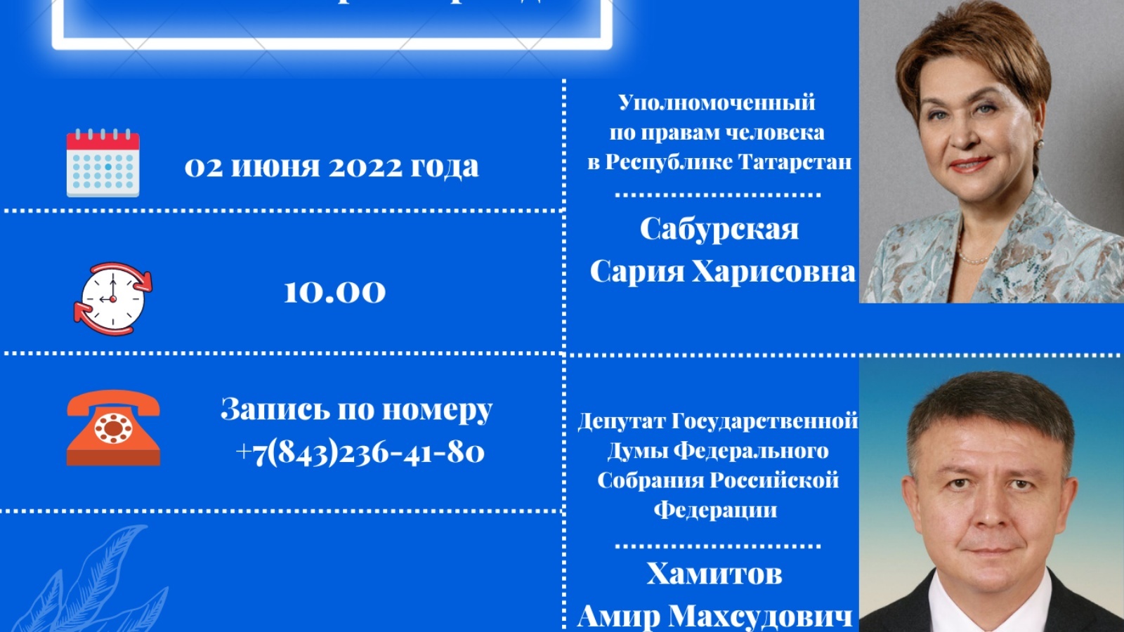 2022 елның 2 июнендә 10.00 сәгатьтә Татарстан Республикасында Кеше хокуклары буенча вәкаләтле вәкил аппараты бинасында Татарстан Республикасында Кеше хокуклары буенча вәкаләтле вәкил Россия Федерациясе Федераль Собраниесе Дәүләт Думасы депутаты Әмир Мәхмүт улы Хәмитов белән берлектә гражданнарны кабул итә.