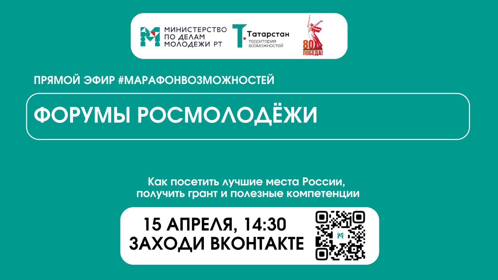 Татарстан яшьләренең Росмолодежның Бөтенроссия форумнарында һәм алар кысаларында физик затлар арасында уздырыла торган Яшьләр проектларының «Росмолодежь.Грантлар " Татарстан Республикасы Яшьләр эшләре министрлыгы 2025 елның 15 апрелендә 14:30 сәгатьтә #марафон мөмкинлекләре (алга таба - Туры эфир) эфирын үткәрүне планлаштыра.